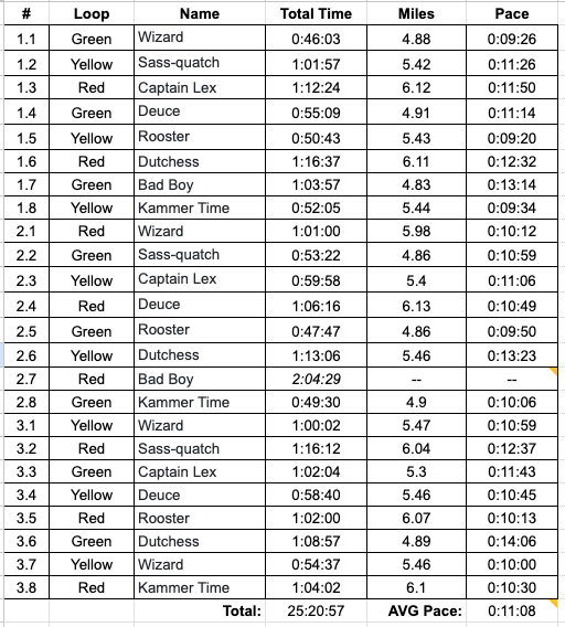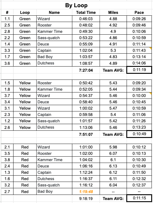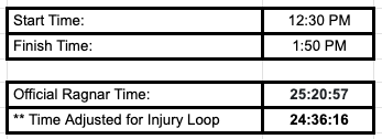 * Bad Boy — Rolled his ankle and took a nasty tumble on loop one. Despite trying to nurse it – on loop 2, he hit a rut and rolled it again rendering him unable to complete the loop and needing a rescue. He likely would have finished 1:15:00 – 1:25:00 however the loop time Ragnar gave us was 2:30:00. This means our time was inflated by roughly 01:30:00. Consider this when goal setting for next year.